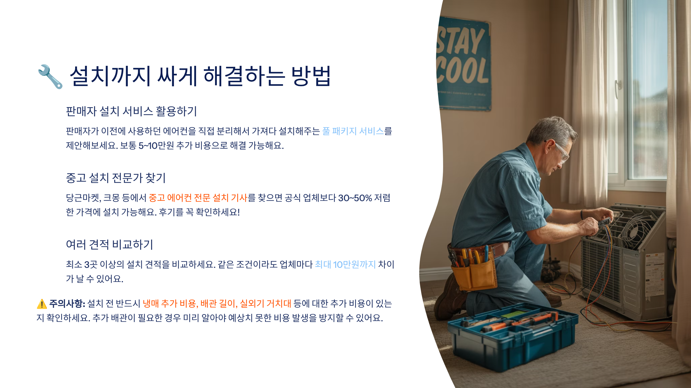 에어컨은 사는 것도 중요하지만, 설치비가 만만치 않아요. 본체는 싸게 샀는데 설치비가 20만 원 이상 붙으면 총 비용이 훨씬 올라가죠. 그래서 설치 포함 금액을 최고치로 보시는게 핵심이에요.
