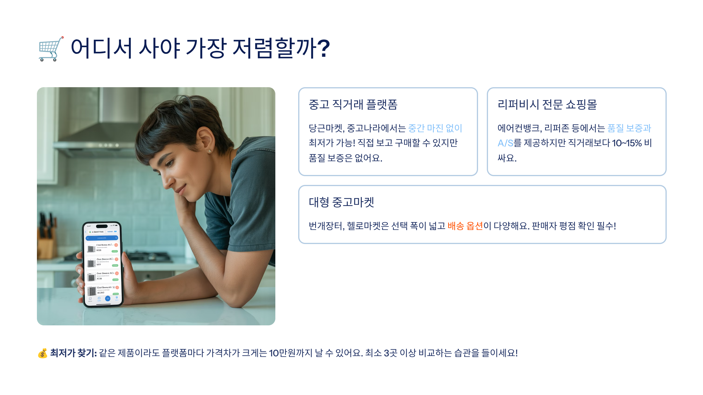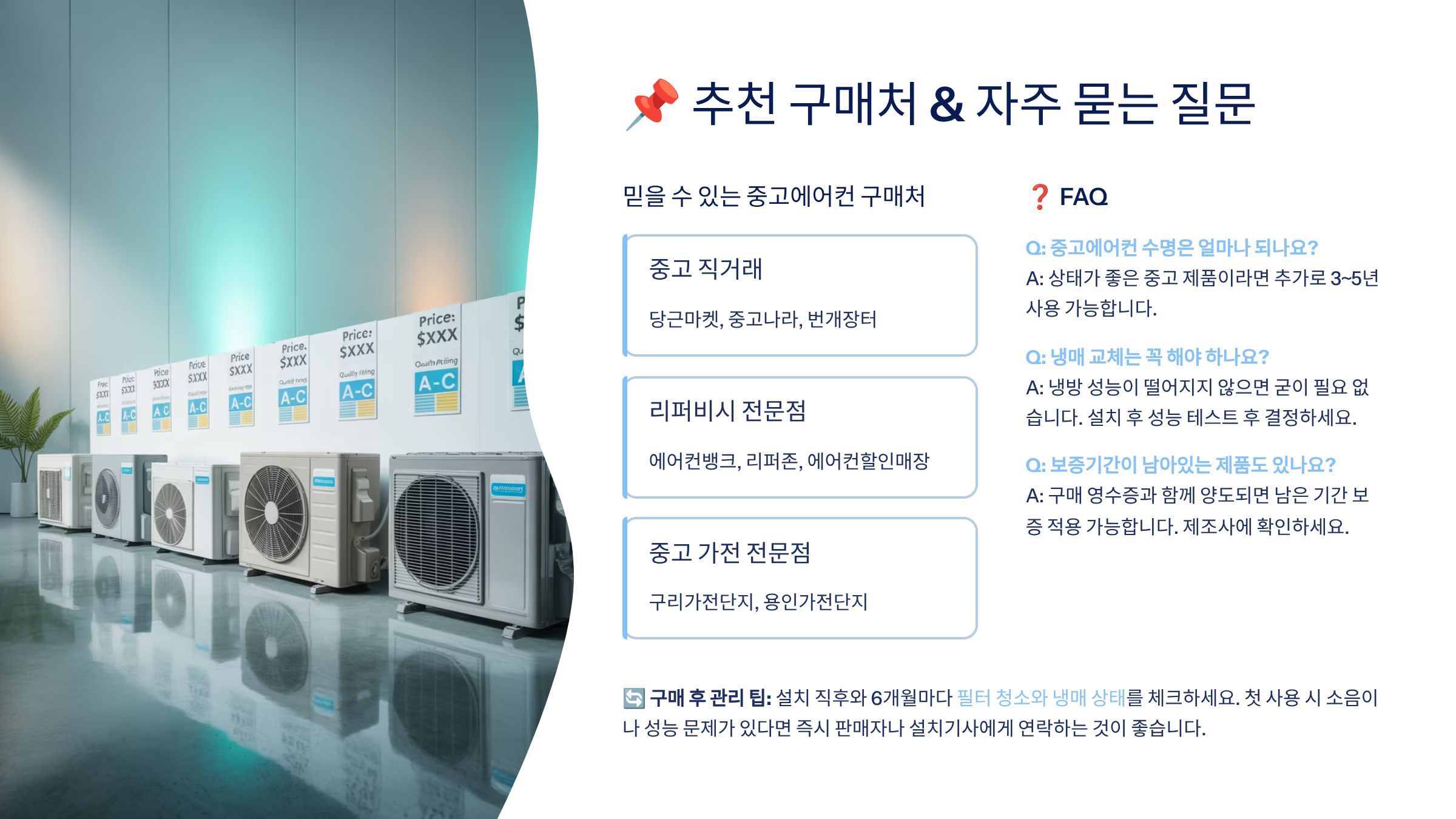 중고에어컨을 저렴하게 사고 싶다면, 구매처 선택이 가장 중요해요. 대표적인 채널은 ‘중고 전문업체’, ‘온라인 스마트스토어’, ‘당근마켓(직거래)’이에요. 각각 장단점이 확실해요.