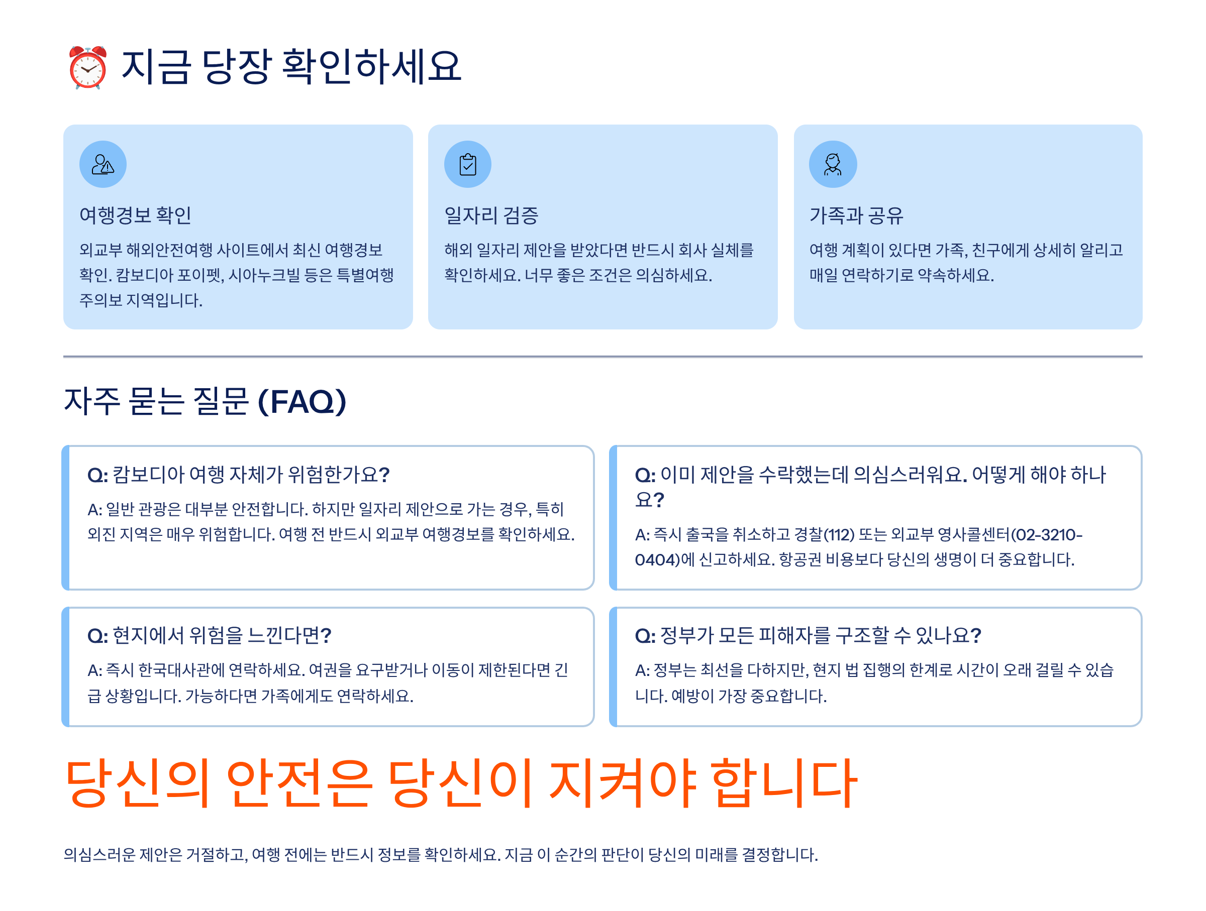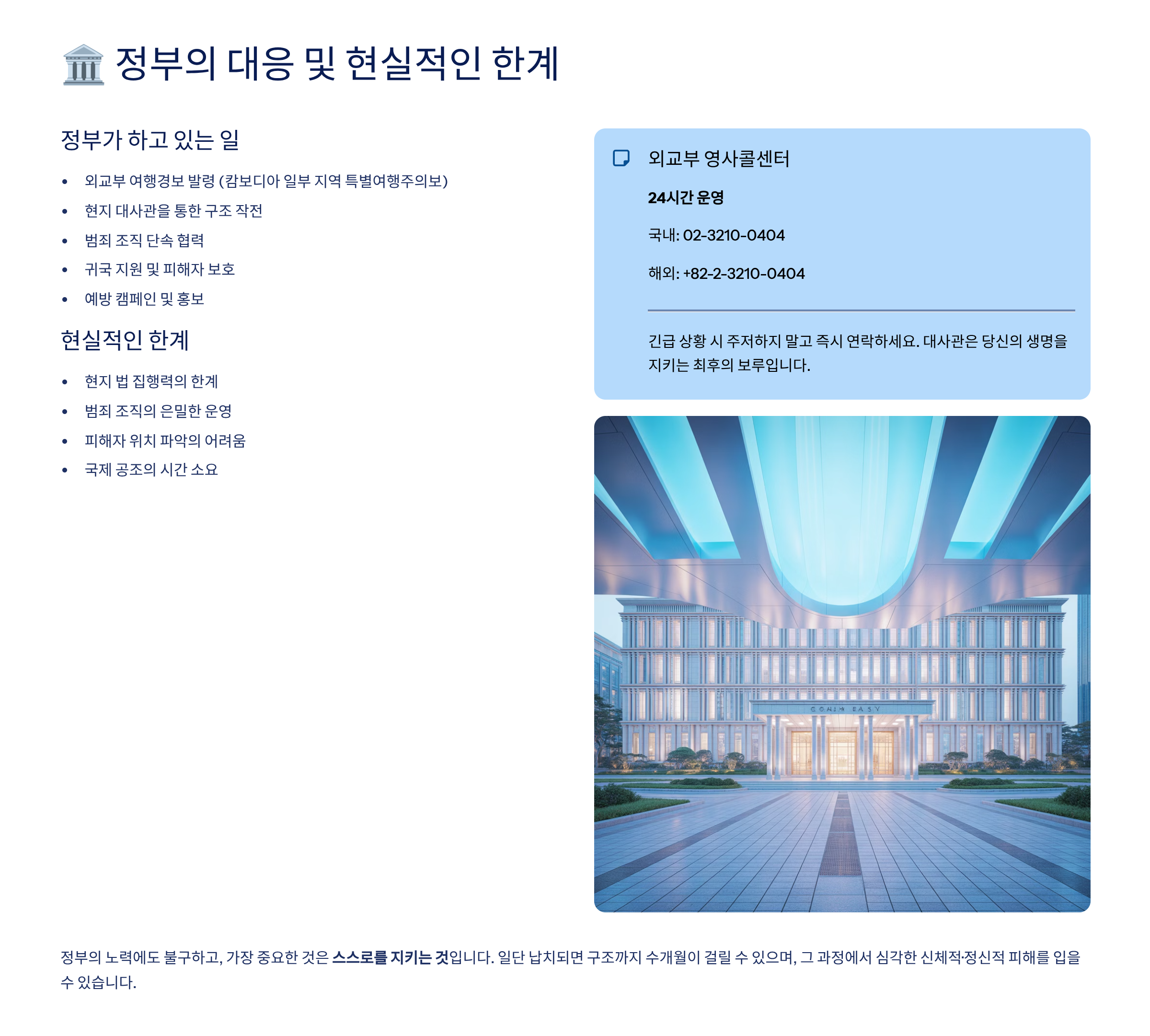 특히 이번 캄보디아 납치 사건처럼, ‘자발적 입국’으로 위장된 형태의 경우에는 구조 요청과 인계까지 더 많은 시간이 필요해요. 피해자들이 스스로 감금 상태임을 알리고 위치를 전해야 수색 범위도 좁힐 수 있죠.