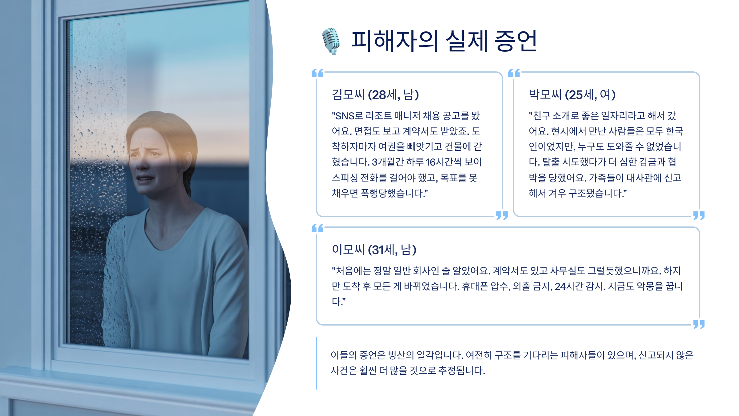 현지에서 누군가 "좋은 자리 있다", "지금 가면 면접 볼 수 있다"는 말을 하면 대부분은 아무렇지 않게 따라가요. 그런데 문제는 바로 거기서 시작돼요. 감금, 협박, 강제 노동으로 이어지는 구조가 이미 조직적으로 세팅돼 있다는 점이 가장 무서운 현실이에요.