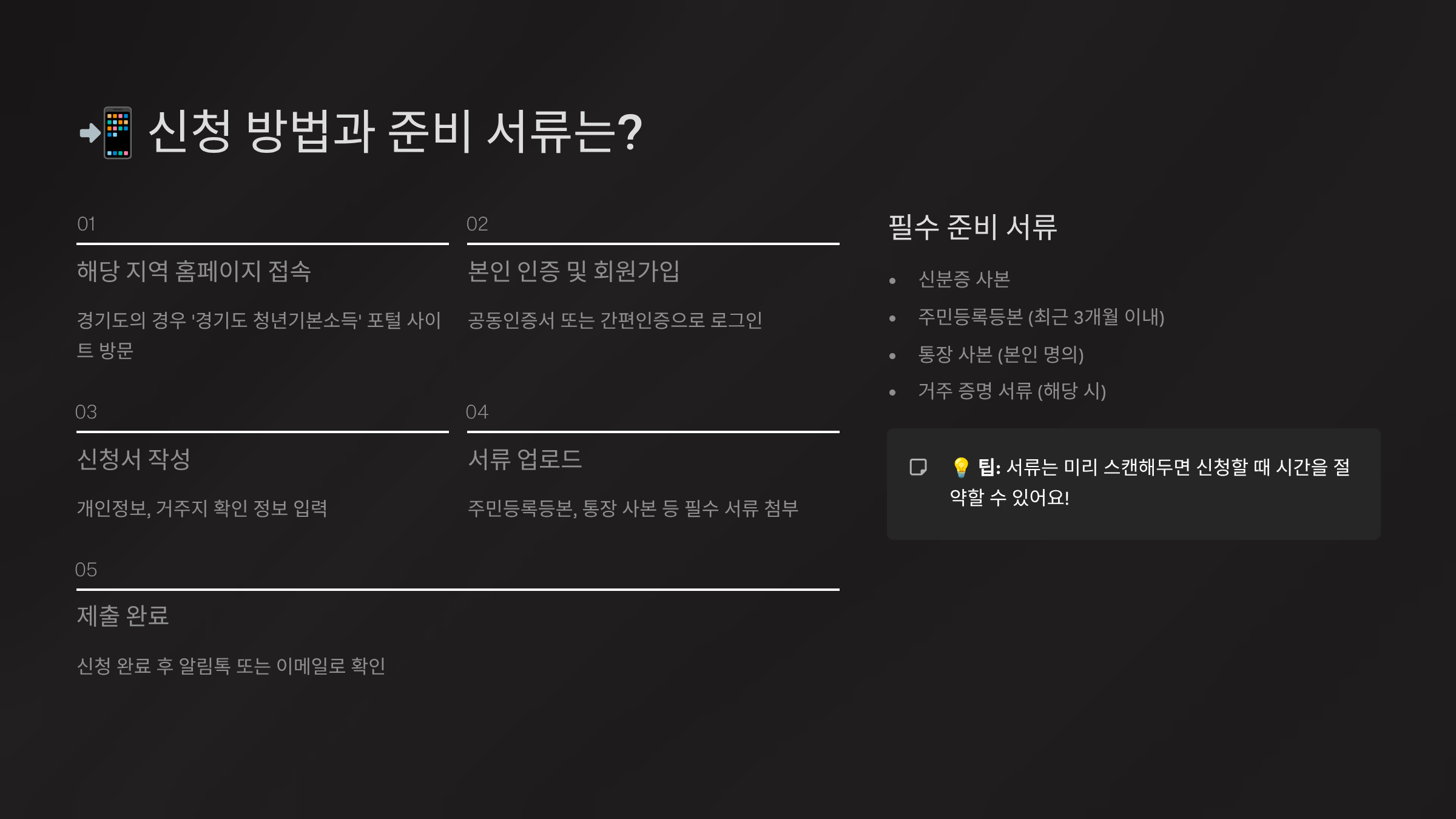 청년기본소득 신청은 온라인으로 간편하게 할 수 있어요. 보통 '경기도 일자리재단' 또는 지자체의 청년포털에서 로그인 후 신청하면 돼요.